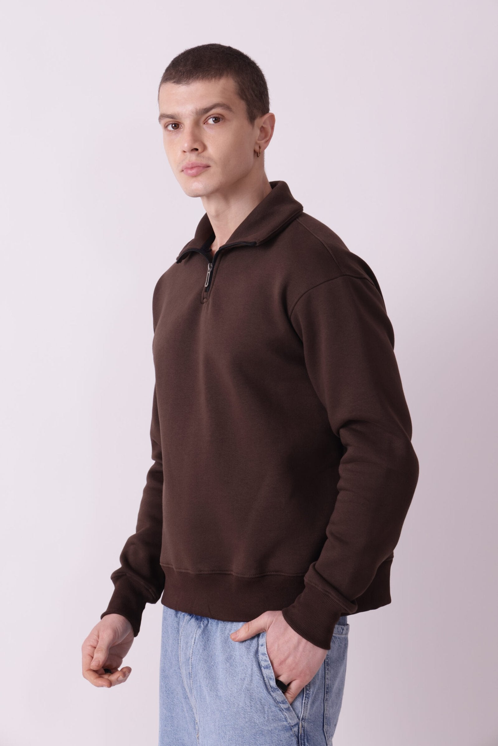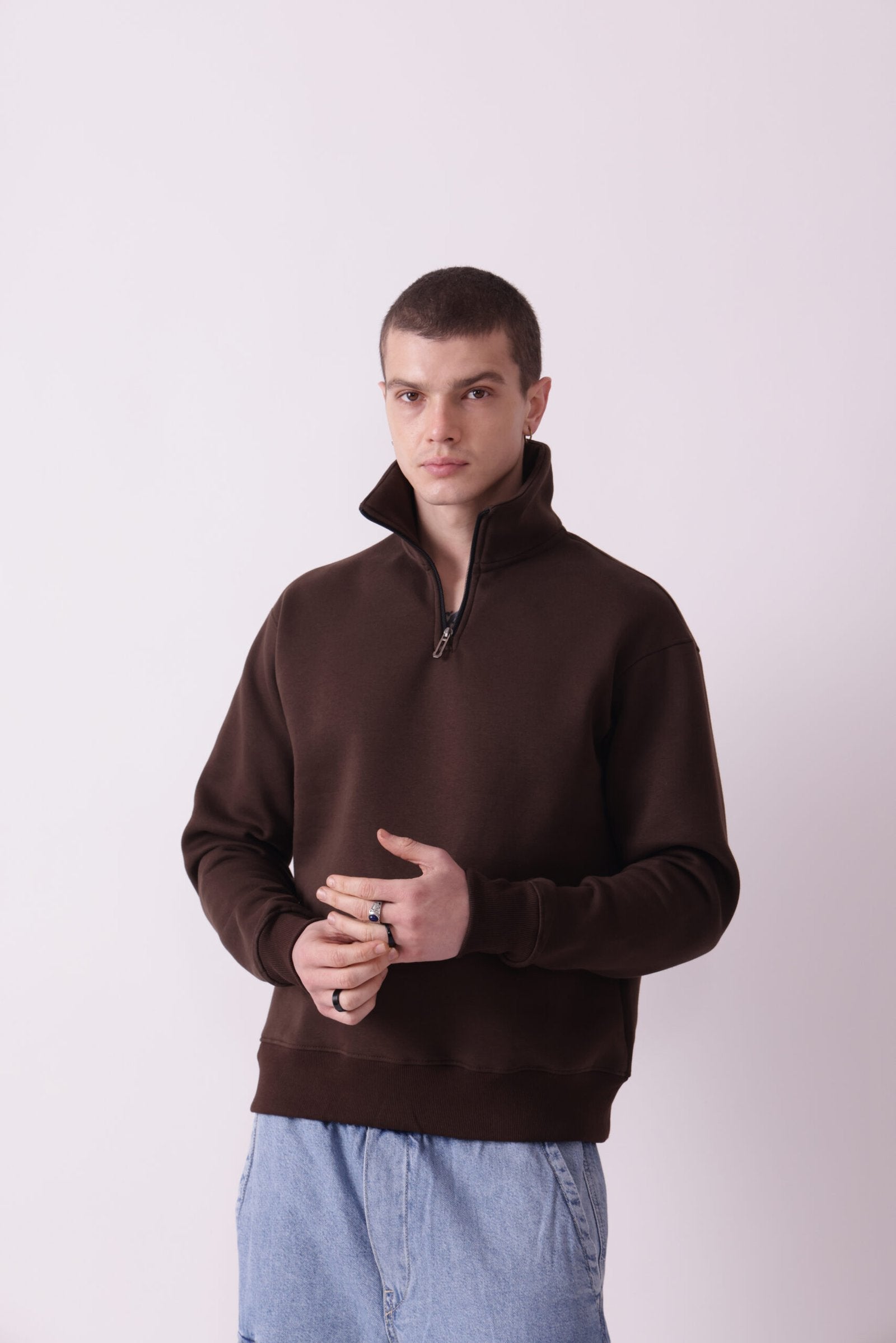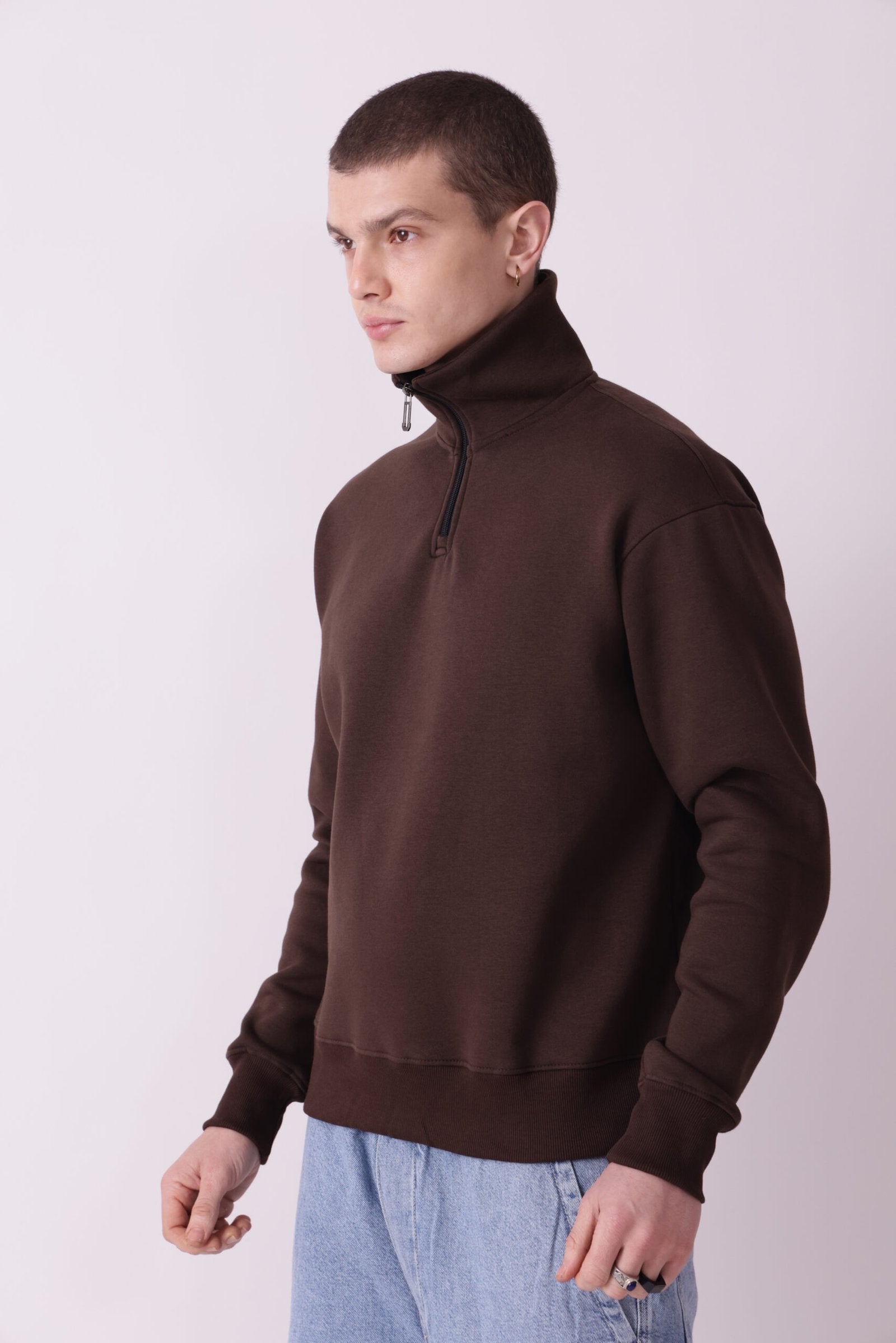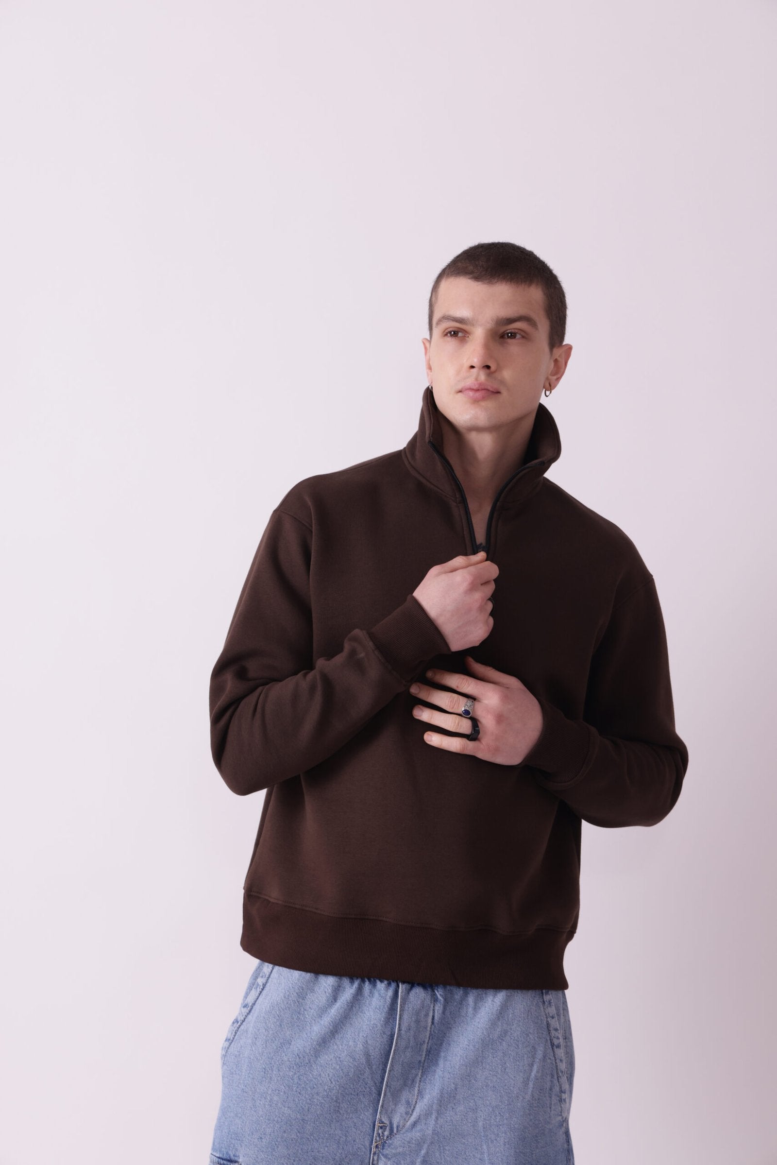 Brown Turtle Neck Zipper Sweatshirt for Men